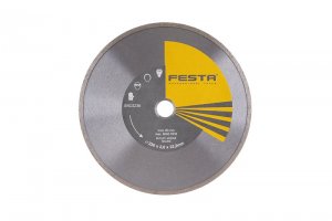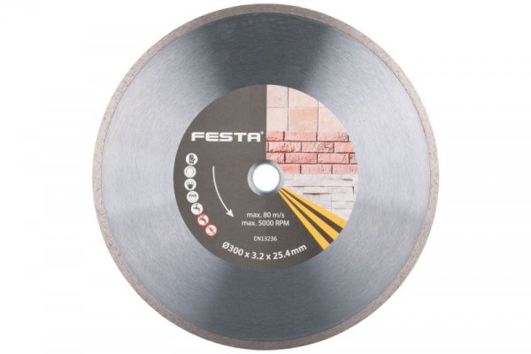 FESTA professional diamond blade, design: FULL - all-round, high-quality diamond layer with a high content of diamond dust, precise processing - connection to the disc carrier disc resistant to high temperatures, use: intended for wet and dry cutting of paving and tiling, concrete, bricks, masonry, granite, marble, stone, glass, ceramics, packaging: blister with euro hole, dimensions: stated in the product name.