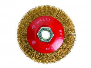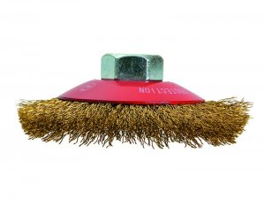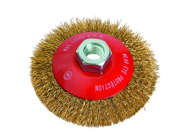 Bowl brush with brass corrugated wires, M14 attachment, bowl, suitable for stainless steel materials.