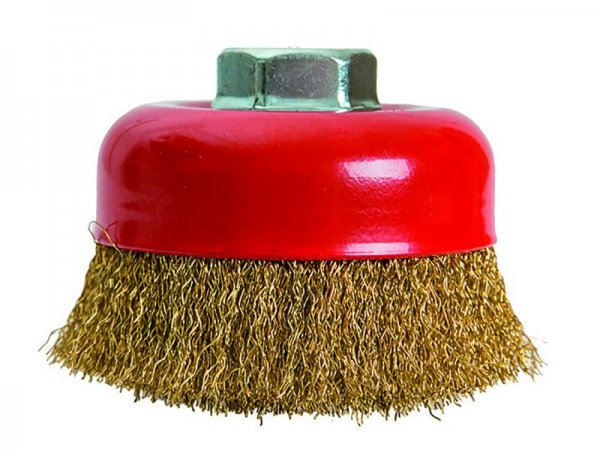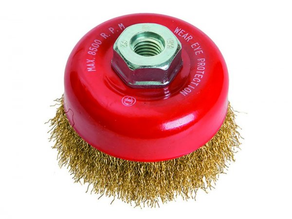 Bowl brush with brass corrugated wires, M14 attachment, cup-shaped, suitable for stainless steel materials.
