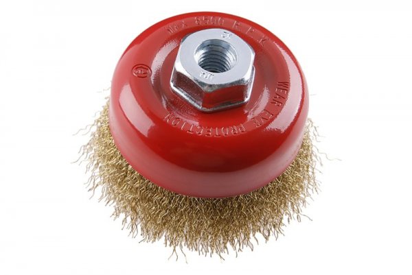 Rotary brush - cup, FESTA brushes guarantee quality used materials and processing, corrugated wire - brass-plated 0.3mm, diameter 100mm, number of wires 2500, wire length 26mm, maximum revolutions per min. 8500, mounting M14*2mm, maximum revolutions per min. 12500, suitable for removing rust, paint, polishing..., packaging: paper box with euro hole.