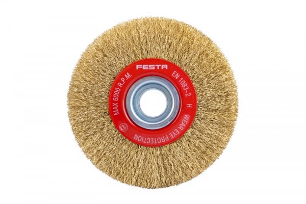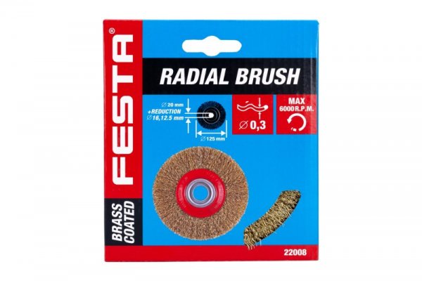 Rotary brush - circular, design: corrugated wire, wire 0.3 mm, FESTA brushes guarantee high-quality materials used and processing, diameter 125 mm, mounting hole 20 mm (including reduction rings 12.5 and 16 mm), number of wires 4950, wire length 22 mm, maximum revolutions per min. 6000, suitable for locksmith and metalworking work, removing rust, paint, polishing..., packaging: paper box.