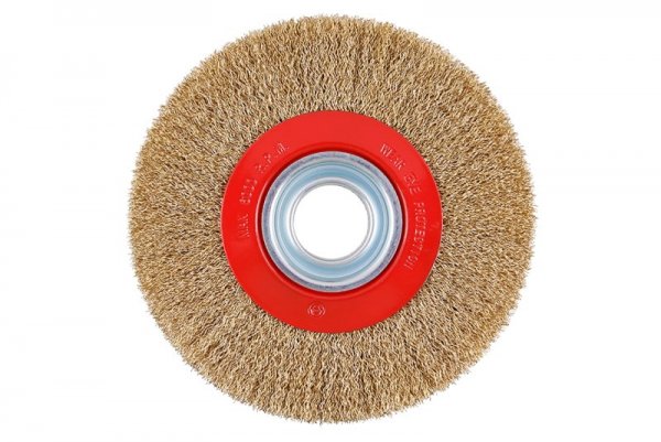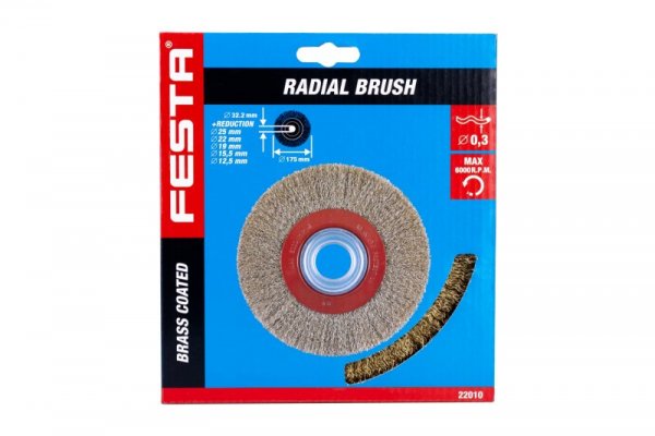 Rotary brush - circular, design: corrugated wire, FESTA brushes guarantee quality used materials and processing, wire 0.3 mm - brass-plated, diameter 175 mm, mounting hole 32 mm (including reduction rings 12.7 mm - 1/2, 15.8 mm - 5/8, 19 mm - 3/4, 22.2 mm and 25.4 mm - 1), number of wires 7200, wire length 41 mm, maximum revolutions per min. 6000, suitable for locksmith and metalworking work, removing rust, paint, polishing..., packaging: paper box.