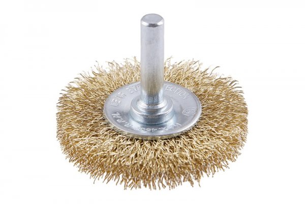 Rotary brush - circular, design: corrugated wire 0.25 mm - brass-plated, diameter 50 mm, shank 6 x 27 mm, galvanized brush body, number of wires: 936, wire length: 12.5 mm, max. permissible revolutions: 4500 1 /min, use: for polishing, roughening, removing rust and burrs, packaging: blister with euro hole.
