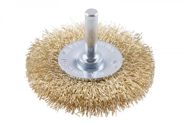 Rotary brush - circular, design: corrugated wire 0.25 mm - brass-plated, diameter 60 mm, shank 6 x 27 mm, galvanized brush body, number of wires: 1080, wire length: 15 mm, max. permissible revolutions: 4500 1/min, use : for polishing, roughening, removal of rust and burrs, packaging: blister with euro hole.