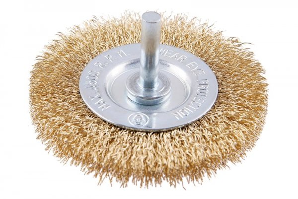 Rotary brush - circular, design: corrugated wire 0.25 mm - brass-plated, diameter 75 mm, shank 6 x 27 mm, galvanized brush body, number of wires: 1728, wire length: 16 mm, max. permissible revolutions: 4500 1/min, use : for polishing, roughening, removal of rust and burrs, packaging: blister with euro hole.