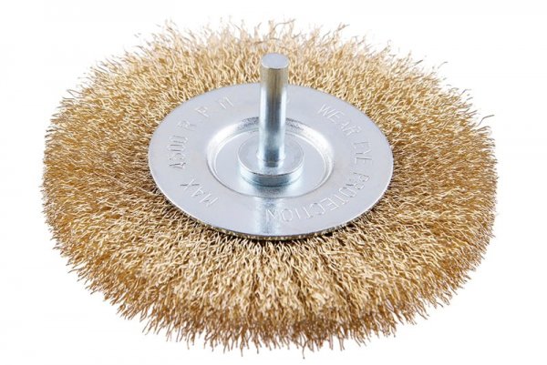 Rotary brush - circular, design: corrugated wire 0.25 mm - brass-plated, diameter 100 mm, shank 6 x 27 mm, galvanized brush body, number of wires: 1800, wire length: 23 mm, max. permissible revolutions: 4500 1/min Use : for polishing, roughening, removing rust and burrs.