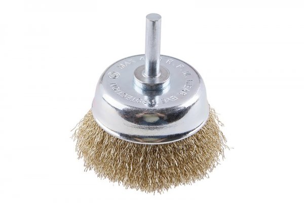 Rotary brush - cup, design: corrugated wire 0.25 mm - brass-plated, diameter 65 mm, shank 6 x 27 mm, galvanized brush body, number of wires: 1512, wire length: 18.5 mm, max. permissible revolutions: 4500 1/ min, use: for polishing, roughening, removing rust and burrs, packaging: blister with euro hole.