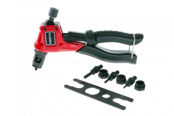 Professional riveting pliers for rivet nuts / nut rivets. Length 200 mm. For M3, M4, M5, M6 nuts from materials: aluminum, brass, steel and stainless steel. 4 rivet adapters are included. The pliers are made of Cr-Mo material, carbon steel and PVC. Using a rivet nut in a riveted joint creates an intact thread to which you can easily attach other components.