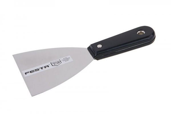Spatula stainless steel FESTA 100 mm with plastic handle. It is used in plastering, painting, painting, body repairs or artistic creation, etc. It is suitable for spreading plaster or other sealants or for removing old paint and coatings.