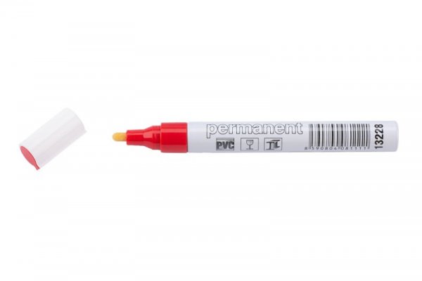 Speciální značkovací barva v hliníkovém pouzdře, síla hrotu 4 mm - červený, popisy železných konstrukcí, skla, plastů, černých strečových folií a tmavých podkladů, max.80°C.
