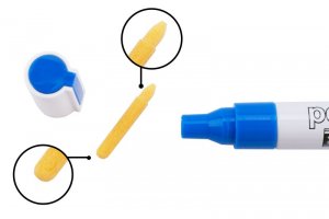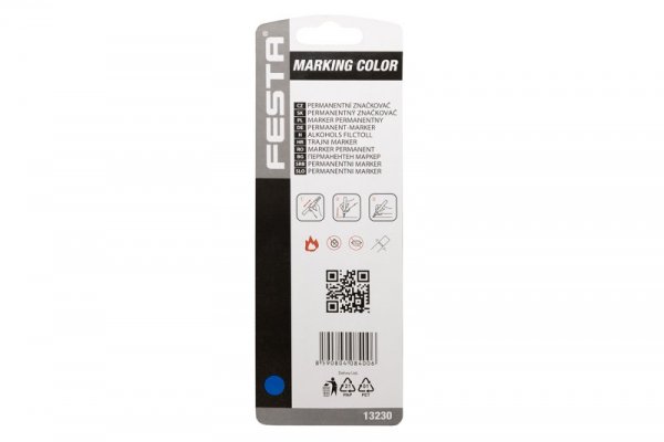 Speciální značkovací barva v hliníkovém pouzdře - modrý, síla hrotu 4 mm - popisy železných konstrukcí, skla, plastů, černých strečových folií a tmavých podkladů, max.80°C.