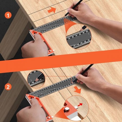 stupnice a speciální otvory - naznačené úhly pro široký rozsah použití, zaměření, značení a práce se dřevem, kovy, plasty apod.