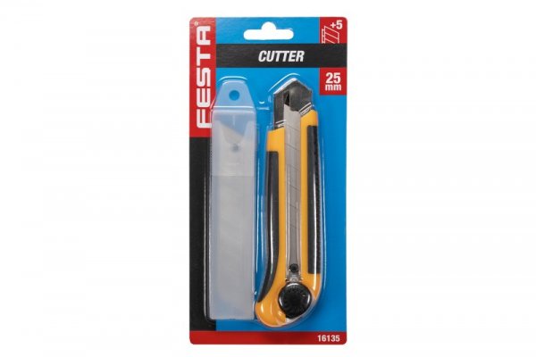 Odlamovací nůž FESTA 25mm, kvalitní materiály, kovová lišta, odolná šroubková aretace, 5 náhradních břitů, blistr.