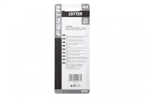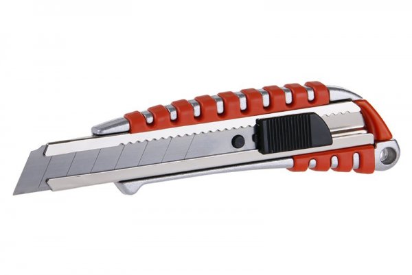 Odlamovací nůž FESTA 18mm, kvalitní materiály, celokovové tělo nože, protiskluzné plastové výstupky, kovová lišta, automatická posuvná aretace, do nože lze umístit až 2 náhradní břity, blistr.