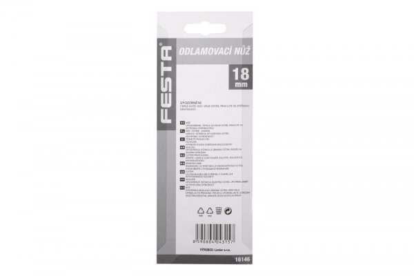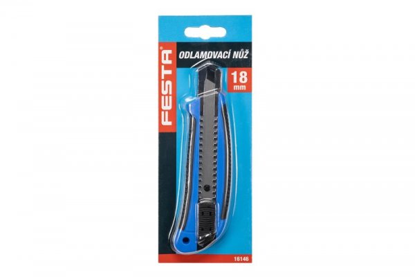 Odlamovací nůž FESTA 18mm, kvalitní materiály, ergonomický tvar s protiskluznou úpravou, kovová lišta, automatická posuvná aretace, do nože lze umístit až 2 náhradní břity, blistr.