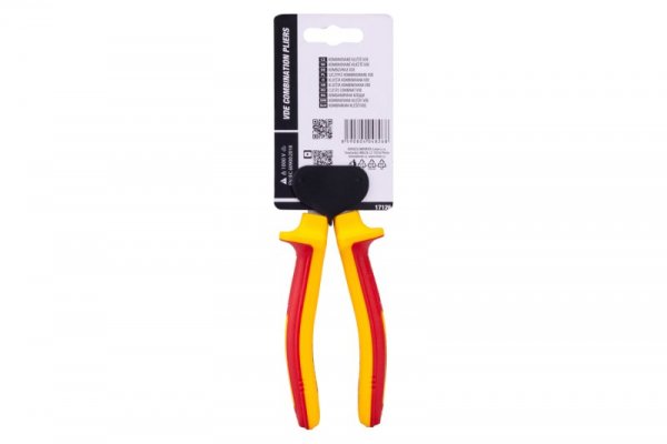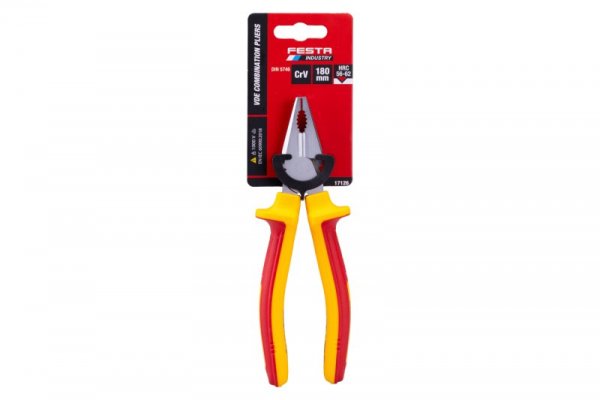 Kleště VDE kombinované 180 mm FESTA mají certifikaci elektro VDE 1000 V, IEC/EN 60900-2004, kombinace polypropylenu a pryže na ergonomicky tvarovaných ručkách zaručuje výborné antiskluzové vlastnosti a dobrou odolnost vůči mazadlům a chemikáliím. Uchopovací čelisti obzvláště odolné proti opotřebení, chromvanadová vysoce výkonná ocel. Hmotnost 0,333 kg.