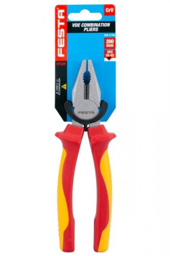 Kleště VDE kombinačky 200 mm FESTA mají certifikaci elektro VDE 1000 V, IEC/EN 60900-2004, kombinace polypropylenu a pryže na ergonomicky tvarovaných ručkách zaručuje výborné antiskluzové vlastnosti a dobrou odolnost vůči mazadlům a chemikáliím. Uchopovací čelisti obzvláště odolné proti opotřebení, chromvanadová vysoce výkonná ocel. Hmotnost 0,383 kg.