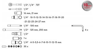 Kvalitní gola sada je vhodná díky kvalitě použitých materiálů a zpracování v profesionální autodílně nebo servisu. 10 let záruka. Všechny části jsou vyrobeny z vysoce kvalitní chrom-vanadiové oceli. Niklová povrchová úprava. Hroty bitů jsou ze slitiny oceli S2. Ráčny mají jemné dělení 72 zubů, tělo ráčny z CrV oceli, zubový mechanismus z S2 oceli, ergonomicky tvarovanou rukojeť se zdravotně nezávadnou gumou. Nový design plastového kufru z primárního materiálu s kovovými uzávěry a panty víka.
