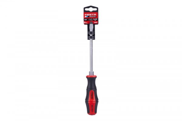Kovový dřík šroubováku FESTA je vyroben z kvalitní chromvanadiové oceli, kalený hrot je magnetický, dřík šroubováku je pevně spojen s úderovou koncovkou, u rukojeti je šestihran pro použití klíče, kombinace polypropylenu a pryže na rukojeti a její ergonomický tvar zaručuje dobré antiskluzové vlastnosti a dobrou odolnost vůči mazadlům a chemikáliím.