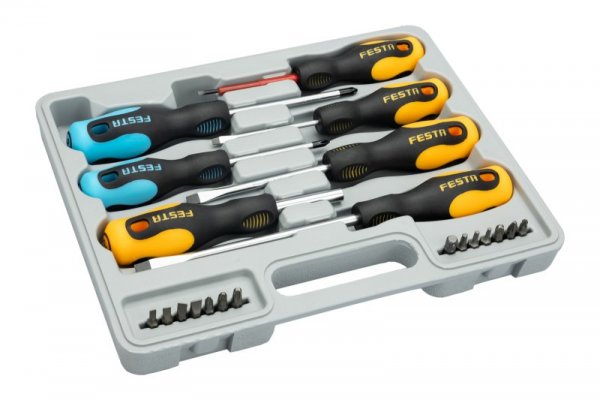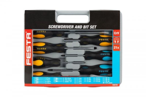 - 1x šroubovák na bity, 14x bit ploché 4, 5, 6, 7 - PH 1, 2, 3 - PZ 1, 2, 3 - Torx T 15, 20, 25 a adapter šestihran 1/4" / čtyřhran 1/4"