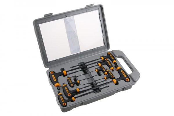Sada nejpoužívanějších rozměrů L šestihranných klíčů FESTA (imbusů) s plast-pryžovou rukojetí včetně antiskluzového povrchu, CrV, tvrzených v celé délce, baleno v praktickém zavíracím kufříku s průhledem (šestihran 22,5345678 10).