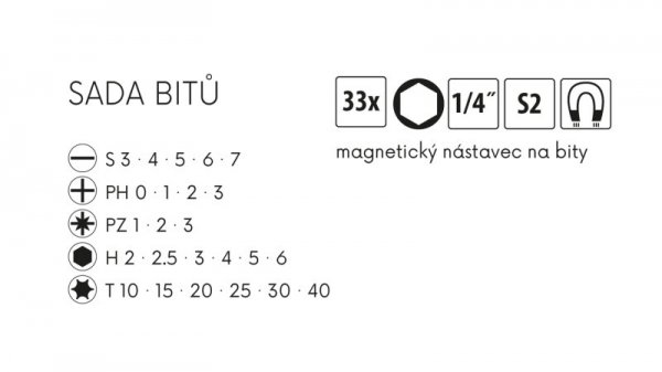 Sada bitů 33ks, S2 (5031), S, PZ, H, PH, T + magnetický nástavec.