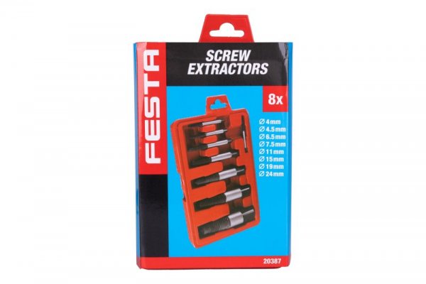 8-ti dílná sada vytahováků šroubů FESTA, použití: k vytahování zlomených a zalomených šroubů, závitových tyčí...., nutné předvrtání, díky opačné šroubovici postupným zavrtáním do otvoru dojde k vyšroubování - popř. vytočení zalomeného dílu, pro profesionální použití, pro profesionální použití, rozměry: 4, 4.5, 6.5, 7.5, 11, 15, 19, 24 mm, praktický plastový box pro uložení.