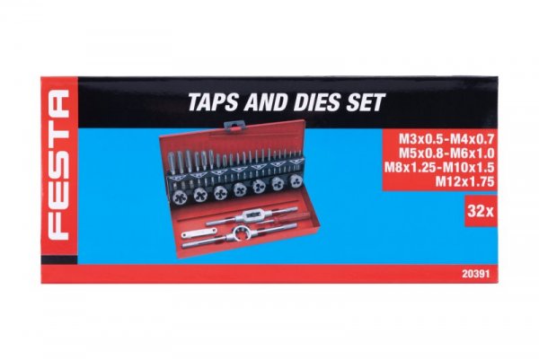 Sada sadových závitníků a závitových oček v plechovém boxu. Součásti balení: sadové závitníky M3 - M12, závitové očka M3 - M12, vratidlo pro závitová očka 25 x 9mm, stavitelné vratidlo pro ruční závitníky M3 - M12, závitová měrka, šroubovák. Sada obsahuje výběr nejpoužívanějších rozměrů závitových oček.
