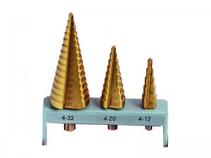 - sada stupňovitých vrták z kvalitní HSS oceli DIN 1412C s TiN vrstvou