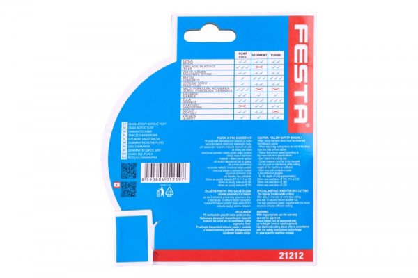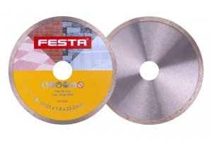 Profesionální diamantový kotouč FESTA, provedení : PLNÝ - celoobvodový, kvalitní diamantová vrstva s vysokým obsahem diamantového prachu, přesné zpracování - napojení na nosný disk kotouče odolávající vysokým teplotám, použití : určený pro mokré i suché řezání dlažby a obkladů, betonu, cihel, zdiva, žuly, mramoru, kamene, skla, keramiky, balení : blistr s eurootvorem, rozměry : uvedeny v názvu výrobku.
