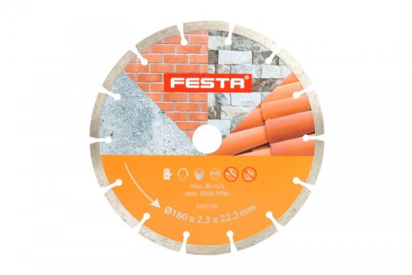 Profesionální diamantový kotouč FESTA, provedení : SEGMENTOVÝ, kvalitní materiály i zpracování - vysoce pevné uchycení diamantových segmentů k nosnému disku kotouče, vysoký obsah diamantového prachu v segmentech, použití : pro suché řezání betonu, cihel, zdiva, kamene, ... , balení : blistr s eurootvorem, rozměry : uvedeny v názvu výrobku.