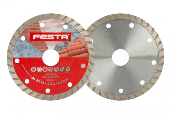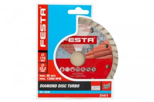 Diamantový kotouč FESTA, provedení : TURBO, kvalitní materiály i zpracování, speciální tvar diamantových segmentů i konstrukce a pevné uchycení k nosnému disku kotouče, vysoký obsah diamantového prachu, použití : pro suché i mokré řezání betonu, železobetonu, cihel, zdiva, kamene, balení : blistr s eurootvorem, rozměry : uvedeny v názvu výrobku.