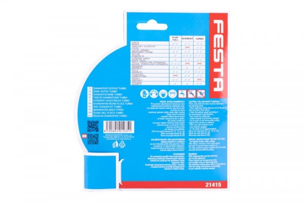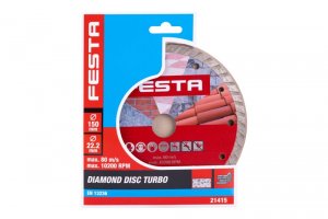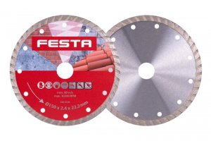 Diamantový kotouč FESTA, provedení : TURBO, kvalitní materiály i zpracování, speciální tvar diamantových segmentů i konstrukce a pevné uchycení k nosnému disku kotouče, vysoký obsah diamantového prachu, použití : pro suché i mokré řezání betonu, železobetonu, cihel, zdiva, kamene, balení : blistr s eurootvorem, rozměry : uvedeny v názvu výrobku.