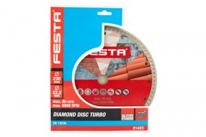 Diamantový kotouč FESTA, provedení : TURBO, kvalitní materiály i zpracování, speciální tvar diamantových segmentů i konstrukce a pevné uchycení k nosnému disku kotouče, vysoký obsah diamantového prachu, použití : pro suché i mokré řezání betonu, železobetonu, cihel, zdiva, kamene, balení : blistr s eurootvorem, rozměry : uvedeny v názvu výrobku.