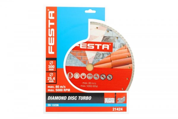 Diamantový kotouč FESTA, provedení : TURBO, kvalitní materiály i zpracování, speciální tvar diamantových segmentů i konstrukce a pevné uchycení k nosnému disku kotouče, vysoký obsah diamantového prachu, použití : pro suché i mokré řezání betonu, železobetonu, cihel, zdiva, kamene, balení : blistr s eurootvorem, rozměry : uvedeny v názvu výrobku.