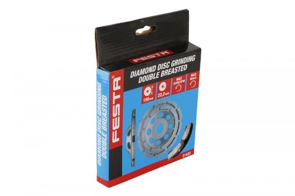 Brusný diamantový kotouč FESTA -dvouřadý, robustní nosný talíř je z pevné slitiny, speciální konstrukce uchycení diamantových segmentů k nosnému disku kotouče, vysoký obsah diamantového prachu v segmentech, použití : pro suché i mokré broušení mramoru, žuly, cihel, zdiva, přírodního i umělého kamene, obkladů, dlažeb, betonu..., tvar a provedení segmentů je vhodné pro hrubé a rchlé obrušování, rozměry : uvedeny v názvu výrobku, balení : papírový box s eurootvorem.