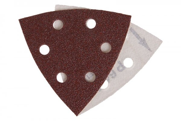 Brusný výsek se suchým zipem ve tvaru trojúhelníků 94x94x94 mm,6 odsávacích děr. Certifikace OSA, Pojivo: pryskyřice, Druh zrna: korund, Podložka: E, Použití: dřevo, ocel, neželezné kovy, barvy, laky, kůže. V balení 5 ks.
