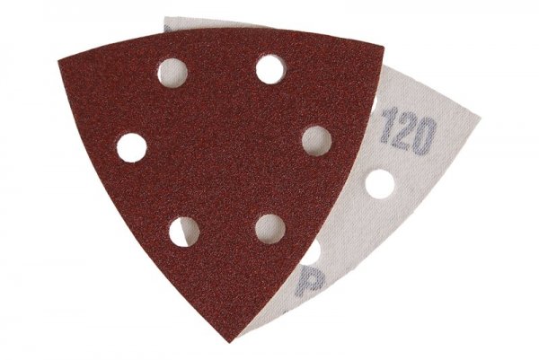 Brusný výsek se suchým zipem ve tvaru trojúhelníků 94x94x94 mm,6 odsávacích děr. Certifikace OSA, Pojivo: pryskyřice, Druh zrna: korund, Podložka: E, Použití: dřevo, ocel, neželezné kovy, barvy, laky, kůže. V balení 5 ks.