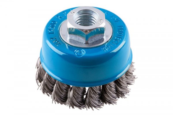Rotační kartáč - hrnkový, provedení : COPY - patentovaný drát nerezová ocel 0,5 mm - copy, se ani při extrémním zatížení nerozplétají, kartáče FESTA zaručují kvalitní použité materiály i zpracování, průměr 75mm, závit M14x2mm, počet drátů: 720, délka drátu : 18,5 mm, max. přípustné otáčky : 12500 1/min, použití : odstranění barvy, rzi, otřepů, zbytků po svařovení, strusky, zdrsňování, čištění kovoých součástí, balení : papírový box s eurootvorem.