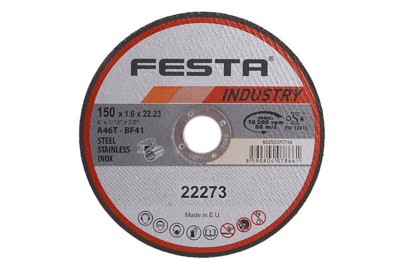 Profesionální řezný kotouč na kov, litinu, NEREZ. Vyrobeno v EVROPĚ!, řada kotoučů FESTA INDUSTRY je, jak již z názvu vyplývá určena zejména pro profesionální použití, kvalita ověřená reálnými zkouškami zaměřenými na počet a rychlost řezů. Druh zrna - KORUND, pojivo - syntetické pryskyřice na bázi aldehydu, provedení - ROVNÝ, max. pracovní rychlost - 80 m/s, max. přípustné otáčky - 12200 ot/min, PRO ZVÝŠENÍ PEVNOSTI ARMOVÁNO DVOUVRSTVOU SKLOTEXTILNÍ VLOŽKOU! KOTOUČE FESTA INDUSTRY SPLNUJÍ EN 12413 a homologaci OSA!