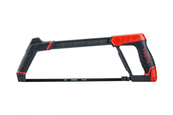 Hliníkový rám, měkčená gumová PTR rukojeť, 300mm ocelový plátek s kalenými zuby, plastový šroub pro rychlou výměnu plátku.