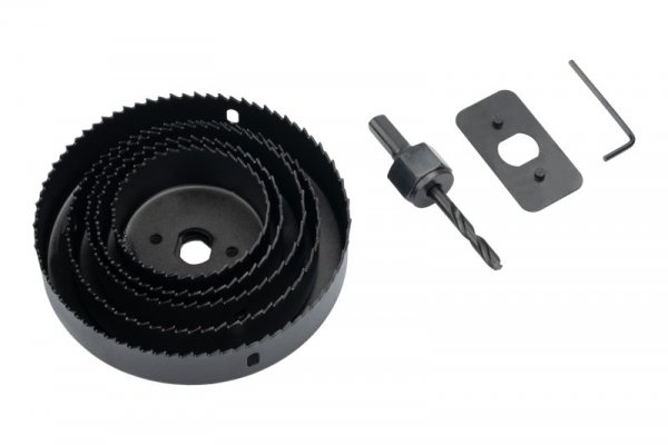 Sada vykružovacích pil 8ks do dřeva a sádrokartonu, průměr: 64,76,89,102,127 mm, inbus+hlavička.