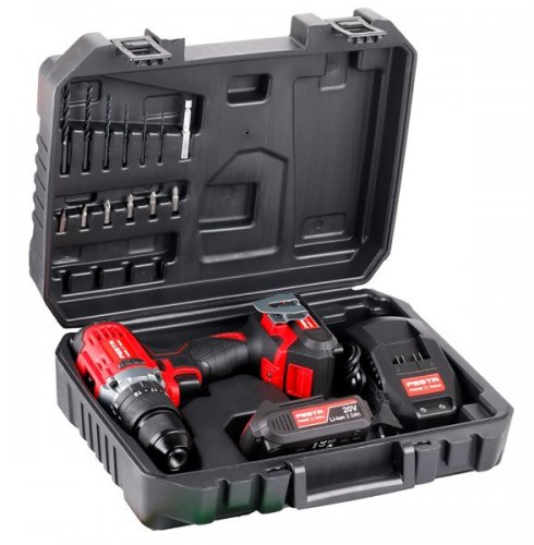 - v praktickém setu v kufru je kromě AKU vrtačky také - 2 x baterie 2.0 Ah, rychlonabíječka 2.4 A, unašeč 1/4", bity a vrtáky HSS