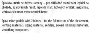 - použití : rozmíchání lepidel na obklady, spárovacích hmot, lepících malt, hotových omítek, mazaniny, stěrkovacích hmot, vyrovnávacích hmot, atd.