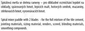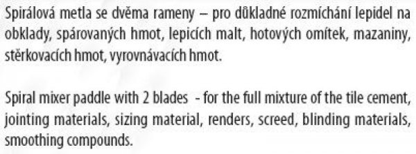 Míchadlo s kruhem, pozinkované, rozměr : 80 x 500 mm - šestihran, použití : spirálová metla se používá pro důkladné rozmíchání lepidel na obklady, spárovaných hmot, lepících malt, hotových omítek, mazaniny, stěrkovacích hmot, vyrovnávacích hmot.