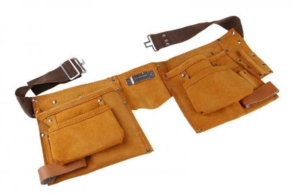 Nářaďový pás, PROFI - kvalitní silná kůže i zpracování - švy, 11 kapes, kůže / nylon, použití : k uložení nářadí a pomůcek, usnadňuje manipulaci a práci - snadné odkladání nářadí i opětovné uchopení, uložení materiálu - hřebíků, šroubů…, komfortní široký nastavitelný pás.