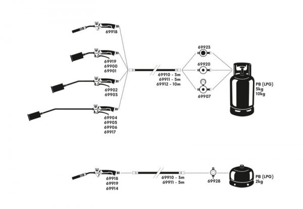 - napojení přes regulátory 69923, 69920, 69907 na lahve 5, 10, 33 kg