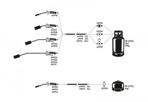 - napojení přes regulátory 69923, 69920, 69907 na lahve 5, 10, 33 kg, přes uzavírací ventil 69928 na láhev 2kg